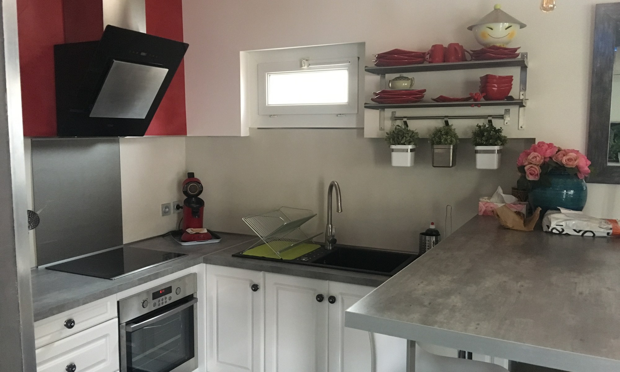 Travaux réalisés par Florent Barillet. Ces travaux comprennent la pose de rails, du placo et des joints. Ils comprennent également le ponçage et la peinture blanche, la peinture tadelakt rouge et enfin la pose d’un enduit masqu’carrelage gris déposé sur la mosaïque.